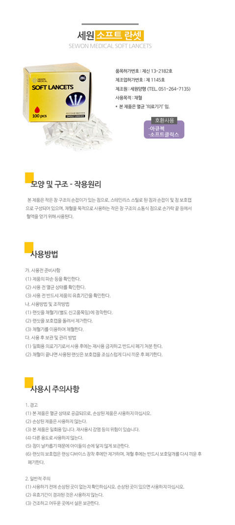 > 세원 사혈침 소프트란셋(아큐첵/글루코트랜드겸용) 28G 100Pcs